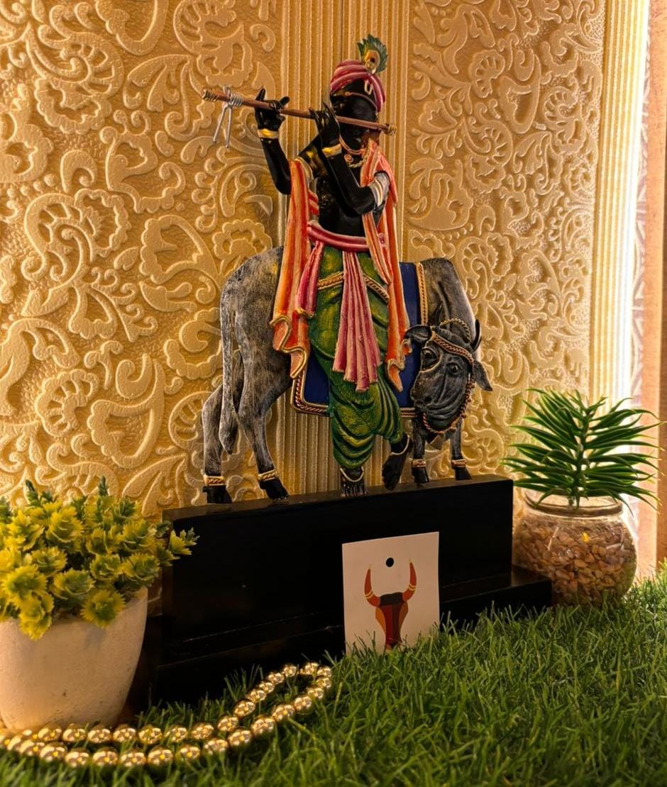 The metalart table top showcases Lord Krishna, the embodiment of love, compassion, and wisdom, standing gracefully alongside a loving cow. Each element of this artwork is intricately designed.The cow, a symbol of abundance and maternal care, radiates a sense of warmth and nurturance, creating a harmonious scene that touches the heart.