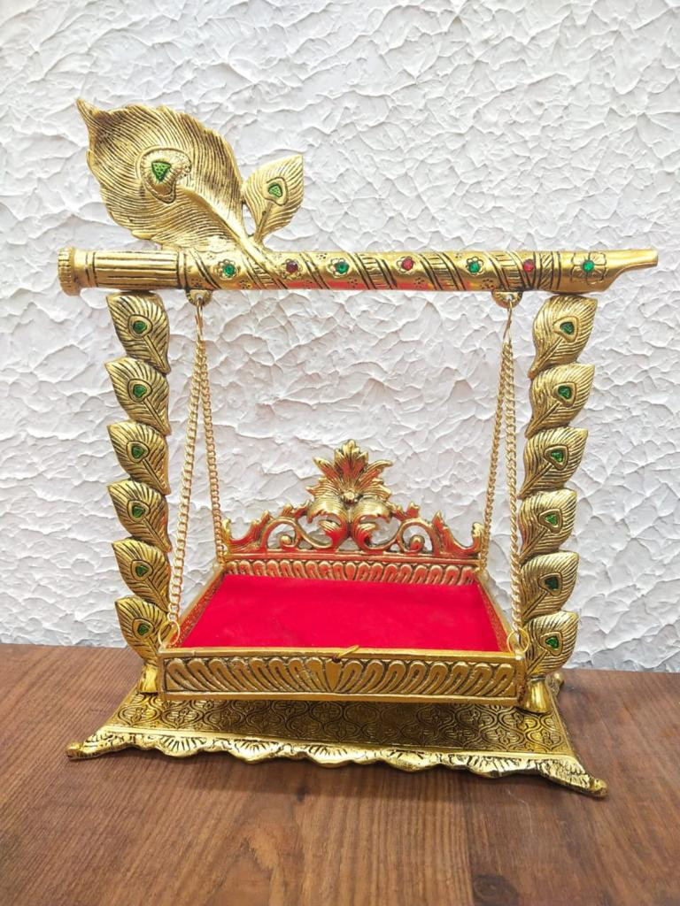 Metal antique *German Silver and brass* finish jhula with finely crafted *peacock feather pillars* and *bansuri*